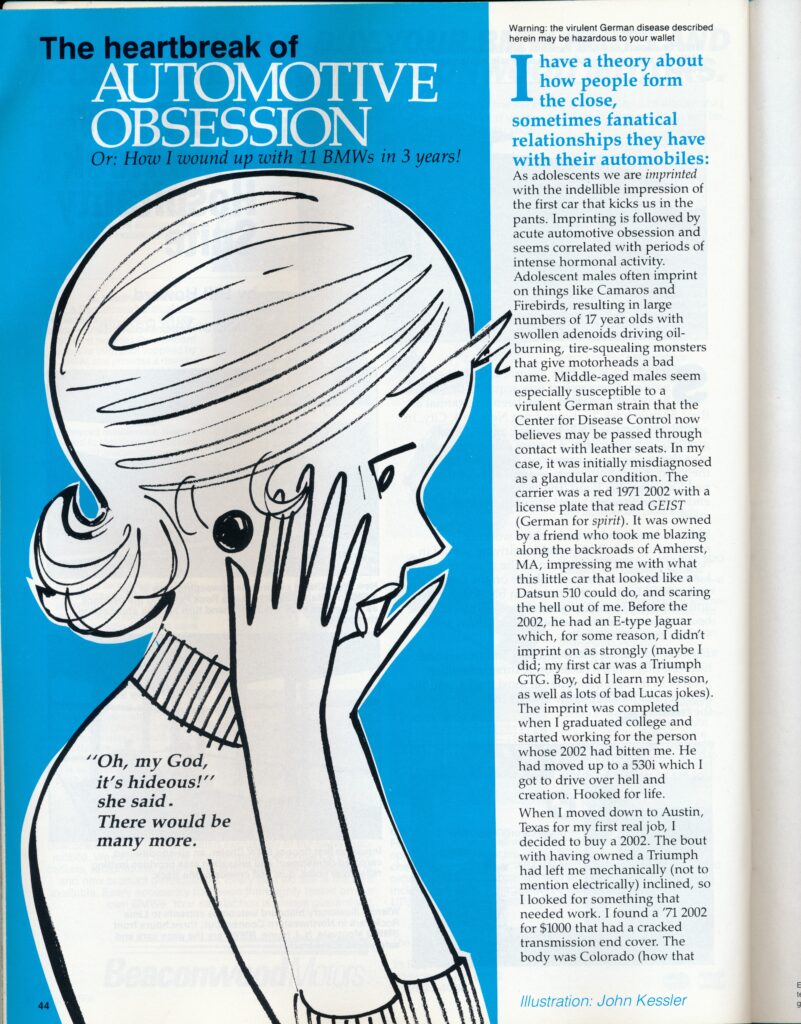 I’ve been writing for Roundel magazine since March 1986, making this my 40th year. I began by writing longer-form pieces, but after a few years, editor Yale Rachlin asked me to become a regular columnist. This crystalized out in my thousand-word Hack Mechanic columns that began in 1990. Writing them has been a joy.