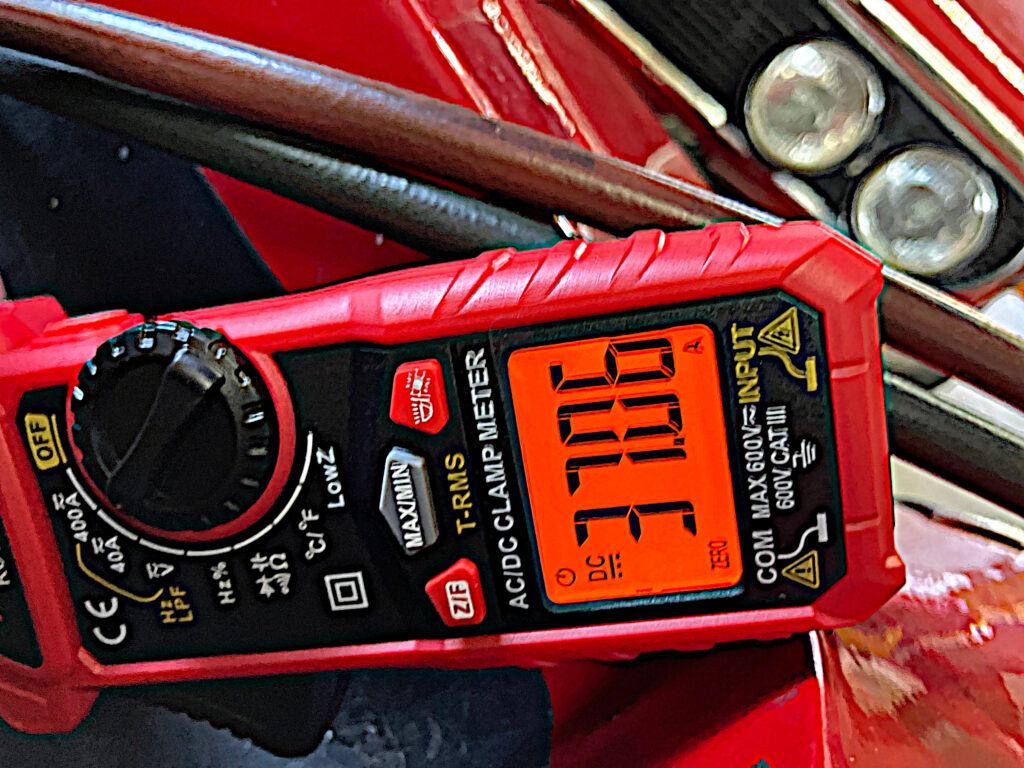 But on the Lotus, I didn’t care about milliamps. If a clamp meter was accurate to within a few amps, that was fine. So I looked on Amazon, found that the $19 clamp meters measured AC current but not DC, and to get one with DC current measurement capability, you needed to kick Jeff Bezos another ten bucks. I clicked and bought this one.