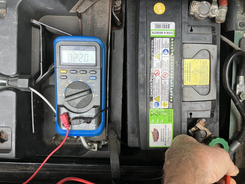 Then I used a conventional multimeter. I first tried all three of the Flukes, and laughed when none of them worked in amperage mode because I’d forgotten that I’d fried one of them and blown the 10amp fuse in the other two and had never bothered to replace it. I pulled the brand-x multimeter out of the tool kit I keep in the Lotus (if you don’t take a multimeter in a car with a Lucas electrical system, you must pray to a god I don’t). I did the measurement several times. It settled down to a very repeatable 220 milliamps.