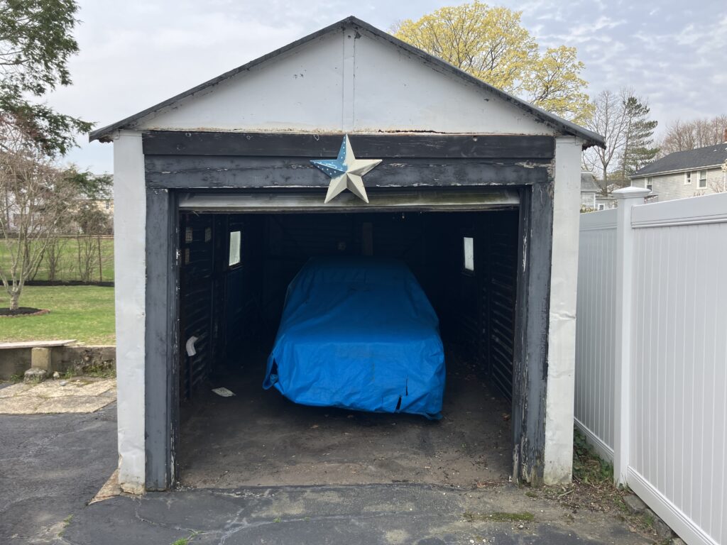 Hampton sitting under wraps in my neighbor’s slightly-leaning WWII-era corrugated metal garage, just like mine before we replaced it.