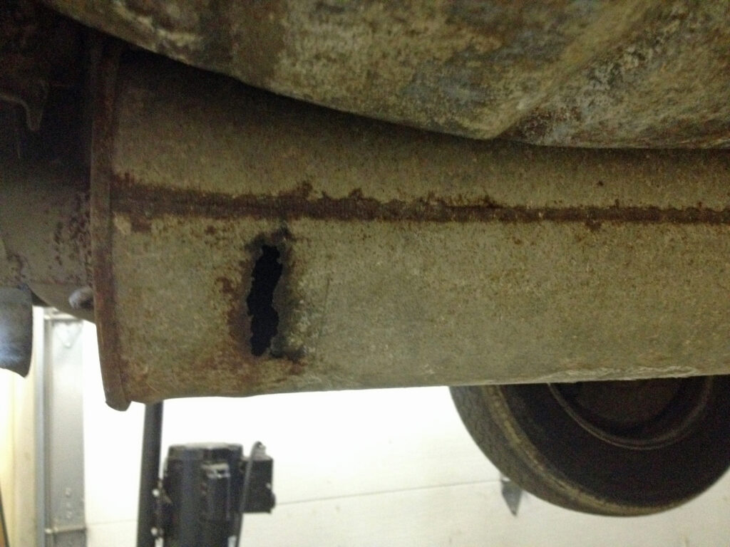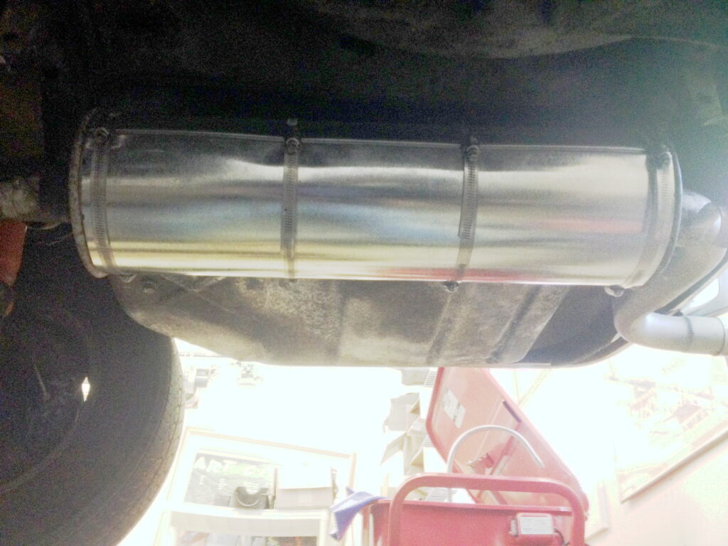 Right. I’m liking the vibe of this sort-out. Let’s knock off the center support bearing, drive this puppy, and see what it really needs. Normally, knowing the exhaust has a hole in it, you’d just take a Sawzall to it and install a new one, but because I hadn’t yet solved the issue of the thousand-dollar exhaust, I didn’t want to destroy it. I tried to disconnect the resonator from the headpipes and muffler, but the whole thing was one solid rusted mass. Fortunately, no part of the Bavaria exhaust goes above the rear subframe, so I was able to drop it intact. I replaced the center support bearing, put the driveshaft back in, and thought let’s just reinstall the exhaust for now so I can get the car inspected, perhaps then drive it to a muffler shop. I looked at the hole in the muffler, and thought, hmmmmn. I measured it, drove to Home Depot, bought a section of chimney pipe, cut it to size, clamped it around the muffler with four big hose clamps, and re-installed the exhaust.