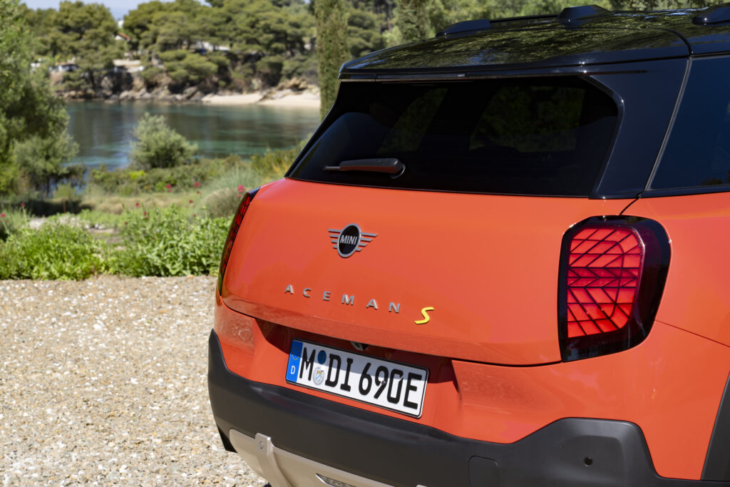 The rear of the vehicle reflects clarity of design, featuring large horizontal surfaces that emphasize the vehicle’s broad and stable stance. The aerodynamically beveled and retracted rear window ensures a pronounced, powerful shoulder section, an effect that is further emphasized by the elongated roof spoiler. The hallmark MINI upright rear lights frame the center section of the rear of the vehicle. With three distinctive graphics, the Matrix rear lights bear out the character of the MINI Aceman in differing ways. A wide, dark surround at the lower edge of the rear apron and the underride protection element integrated in the center make for sporty proportions, thereby conveying the crossover model’s versatile characteristics.