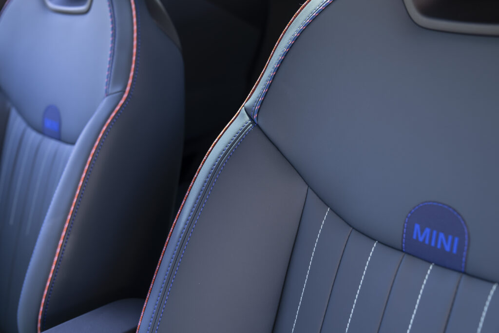 In the Favoured Trim, the interior features a strikingly expressive design. The dashboard comes in the elegant Dark Petrol, complemented by an accentuated colour gradient in orange on the passenger side. The dynamic appearance is further reflected in the sports seats made of perforated Vescin. These are available with traditional accent stitching and an embroidered MINI logo in two colours. The JCW Trim presents the versatile material concept of the MINI Aceman in maximum sporty style. The JCW seat with sports seat geometry and additional lateral support noticeably enhances comfort. Combined with multi-coloured knitted textile and black synthetic leather with red stitching, the colour concept echoes the design of the dashboard and door trim.