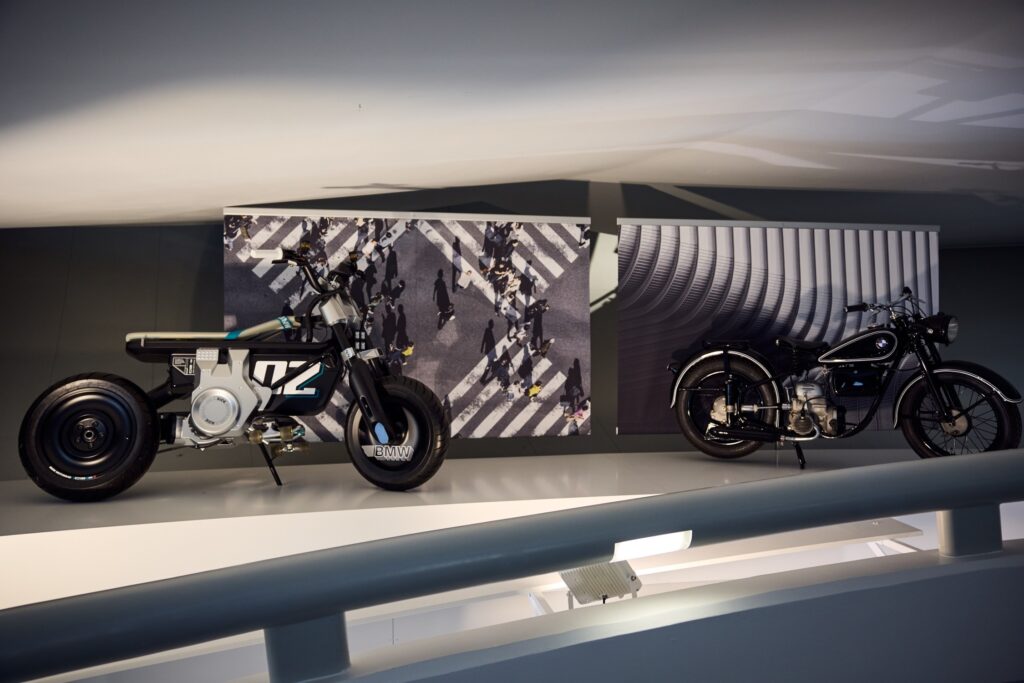 In the exhibition’s wide-ranging content, the concept of the anniversary exhibition proceeds in principle from motorcycle pairings, with a historical vehicle in each case being placed beside a current one. This creates many interesting contrasts on the subjects of innovation, super-athletes, combinations, full cladding, and urban mobility. Visitors will find the most valuable pieces in the exhibition on the way from platform 2 to Motorsport. Here, two machines are presented that are associated with victory in the legendary Tourist Trophy on the Isle of Man: in this road race, which is probably the most difficult in the world, Schorsch Meier was successful on his BMW R 255 Kompressor, and 75 years later Michael Dunlop placed first on a BMW S 1000 RR.