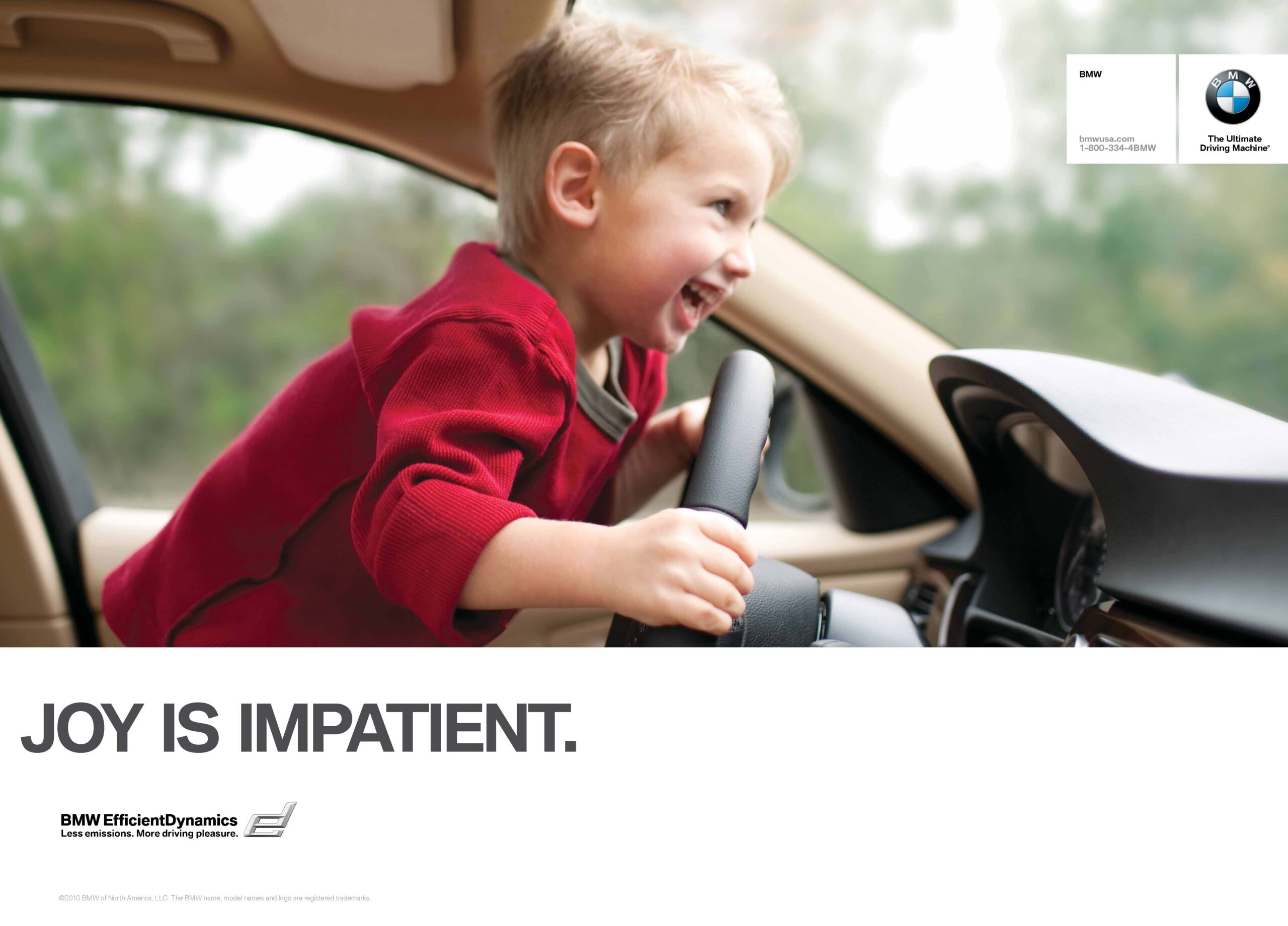 Some of the print ads showed the car only in fragments, emphasizing a small child clinging to the steering wheel above an all-caps “JOY IS IMPATIENT” headline, or a montage of model badges above the words “JOY CAN BE COUNTED.”