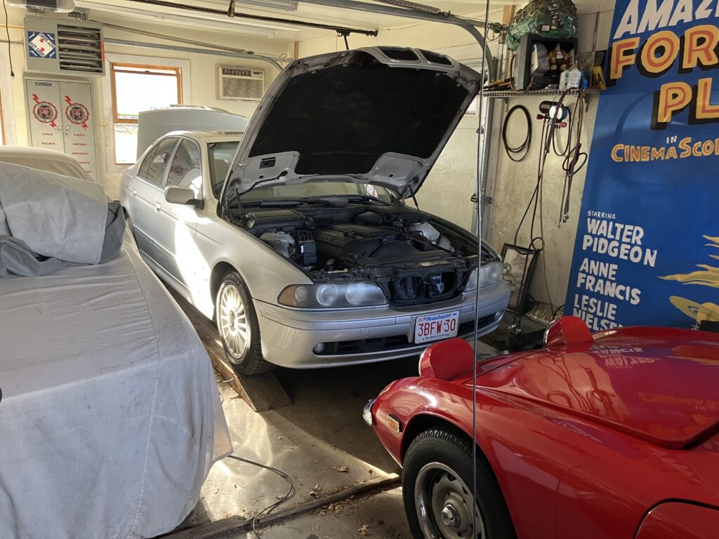 Fast-forward to last week. Maire Anne and I drove up to Nashua NH to drop off her sewing machines for service. We took the E39, which was unusual because it’s kind of incumbent on me to provide “stories-free” transport when we’re both together, so we usually take either her Honda Fit or a very well-sorted vintage car, but for some reason I was feeling like the E39. The 40-minute drive up to Nashua was flawless, but as soon as we began heading back, the battery warning light came on. Maire Anne has been around me long enough to know exactly what that means and what the options are.
