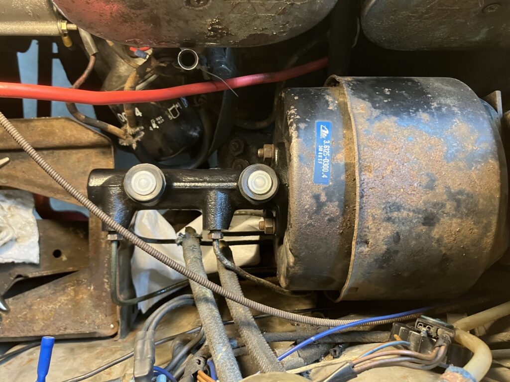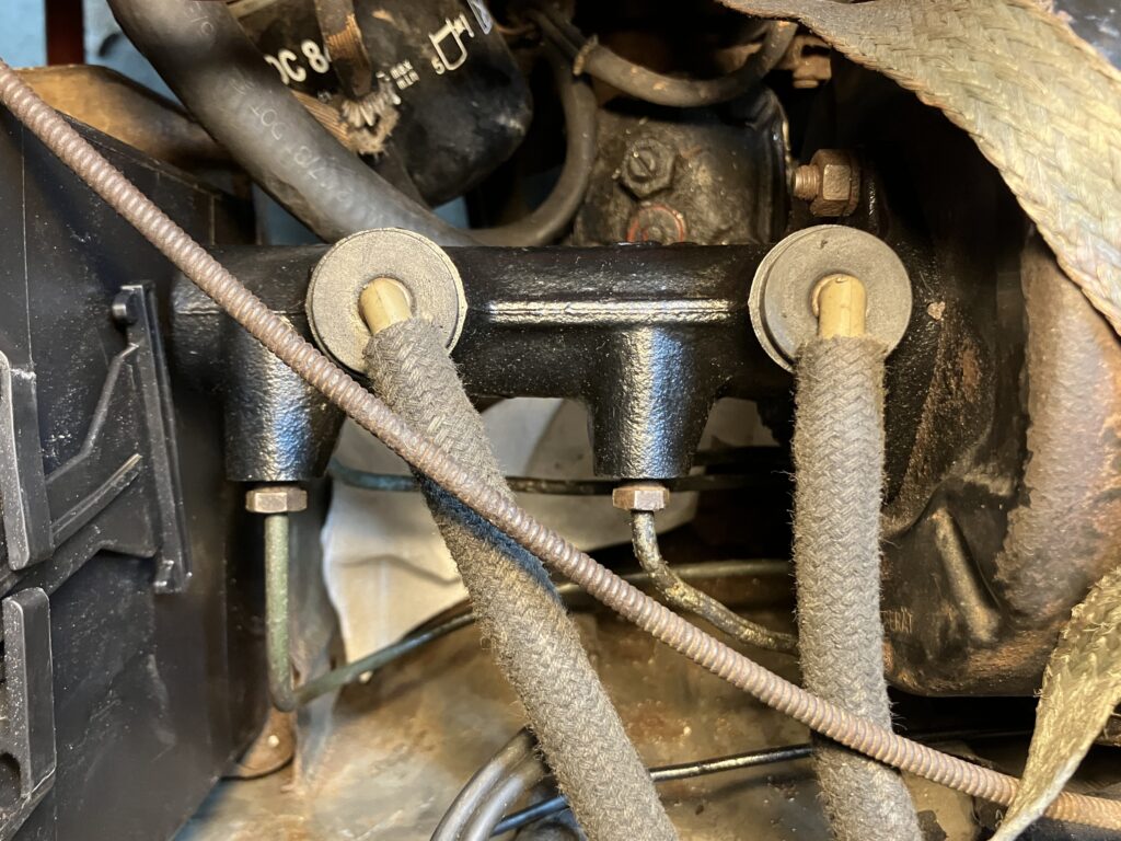 I placed the o-ring in position, slid the brake master cylinder onto its studs on the booster, tightened the nuts, and one at a time, removed the plastic plugs and carefully threaded the brake line fittings into their holes in the master. Then I very carefully snugged them all down (you don’t want to go through all this work only to feel a 50-year-old brake fitting strip or snap).