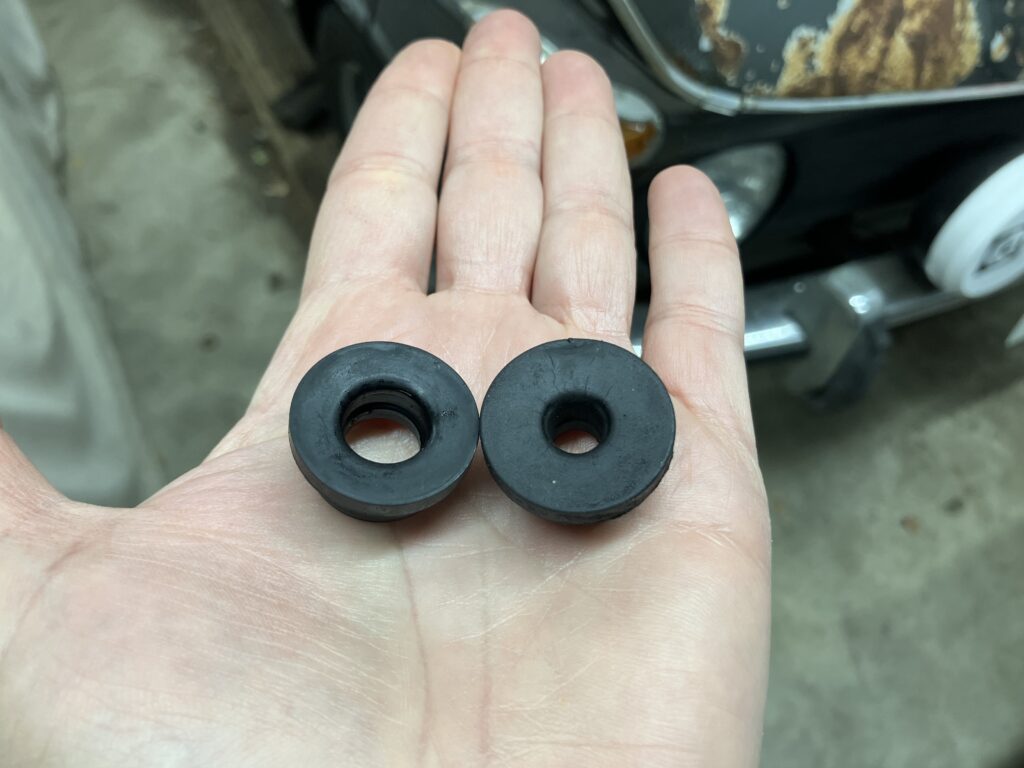 The only pre-brake-fluid part of the job remaining was to insert the elbows into the rubber grommets in the top of the master. So I pulled the plastic plugs out of the grommets, and immediately saw that the holes in them were waaaaay too big to received the elbows. I would’ve sworn I took a photo of it in situ, but maybe not. Here’s a comparison between the grommet that was in the master cylinder I removed versus the ones in the just-installed one.