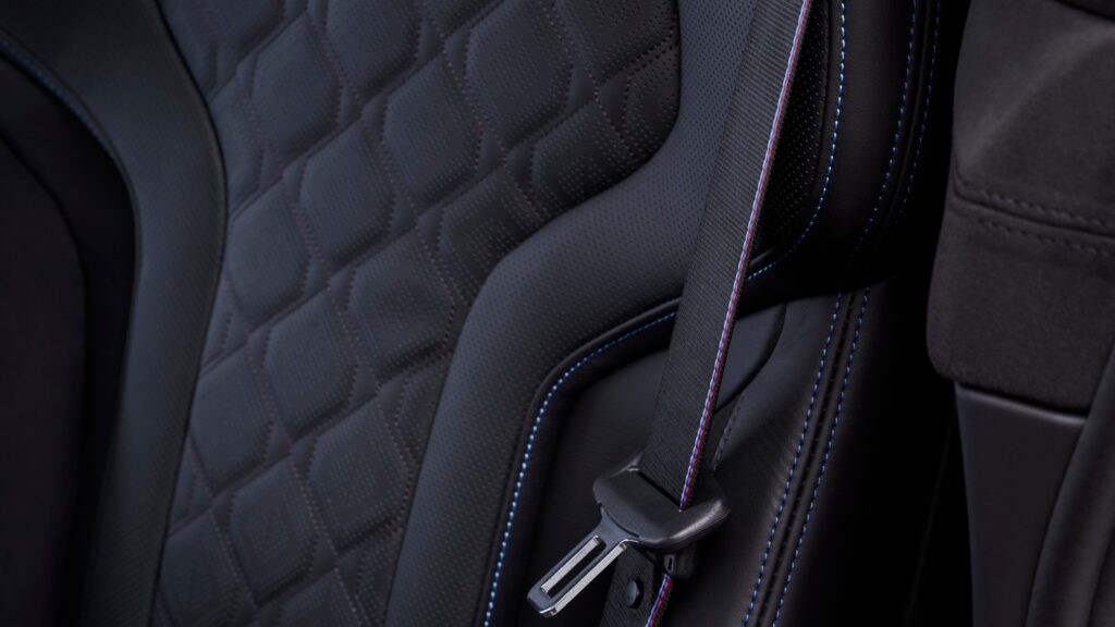 Moving inside, the M850i Edition M Heritage features unique seating, upholstery, and trim elements not available for order on other 8 Series models. The driver and front passenger are provided M Sport seats finished in BMW Individual Black Full Merino Leather and Alcantara, with a diamond-shaped upholstery pattern. Alcantara also graces the headliner, dashboard, and upper door panels. The seats, door panels, and seat belts all feature M tri-color stitching, and there is a special, non-illuminated M badge in each front seat headrest.