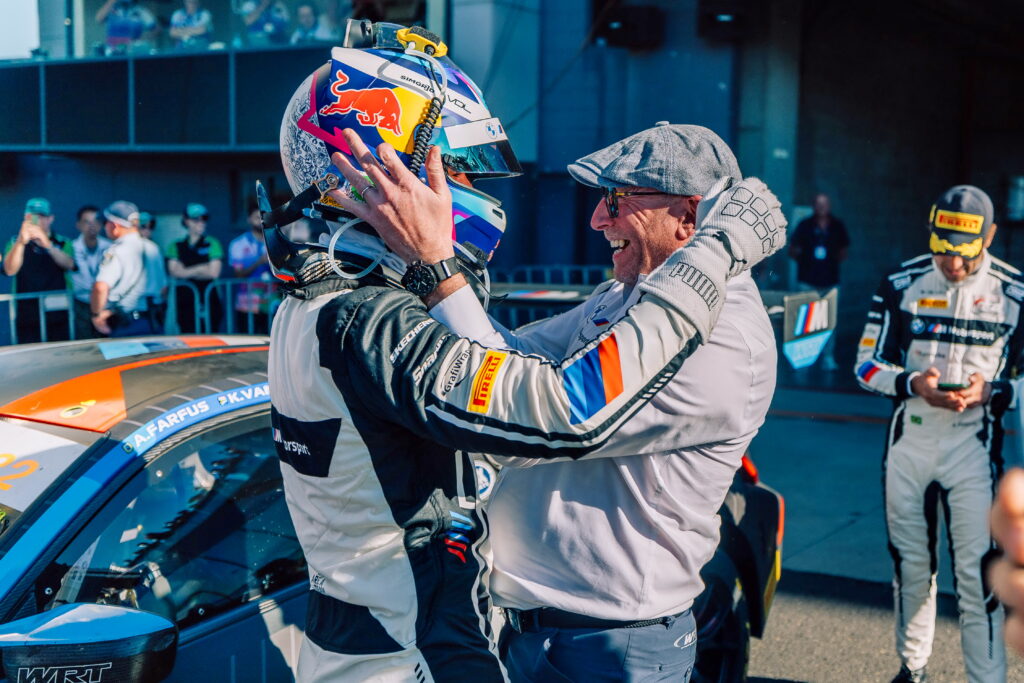 Vosse celebrates with Kelvin van der Linde after winning the Bathurst 12 Hour. (Photo courtesy SRO)