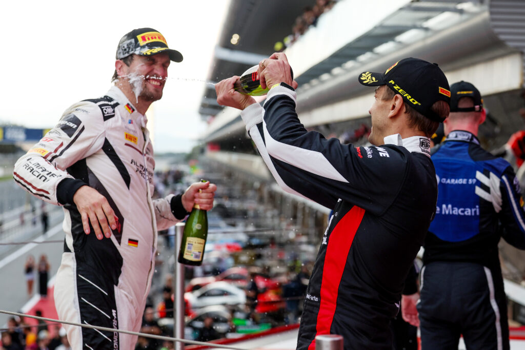 Jens Klingmann (left) gets a face full of champagne from Augusto Farfus.