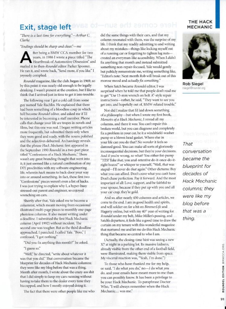 I’ve been writing for Roundel magazine since March 1986, making this my 40th year. I began by writing longer-form pieces, but after a few years, editor Yale Rachlin asked me to become a regular columnist. This crystalized out in my thousand-word Hack Mechanic columns that began in 1990. Writing them has been a joy.