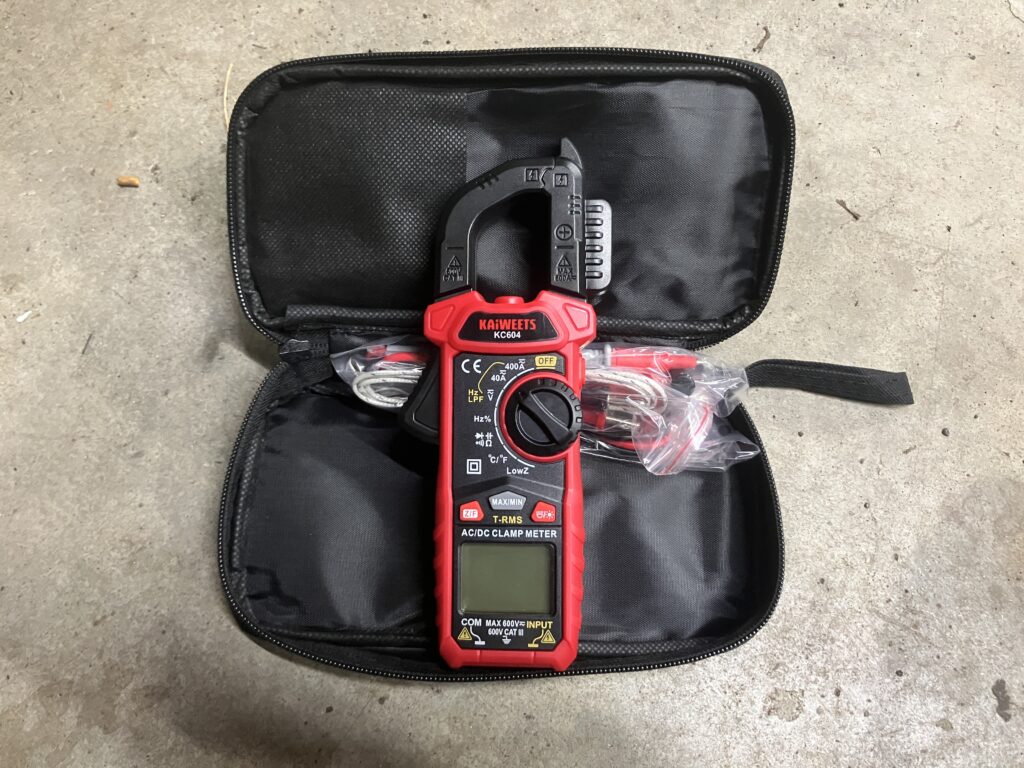 I’d long been interested in buying a so-called “clamp meter,” which is an ammeter that has pincers like a mutant praying mantis that you use to clip around a wire. It infers the amount of amperage by measuring the magnetic field created by the flowing current. The huge advantage is that you don’t need to disconnect wires and connect the meter in series with the circuit as you do with a multimeter. You leave the circuit as-is and simply press a button to spread the clamp opening and put the wire through it.