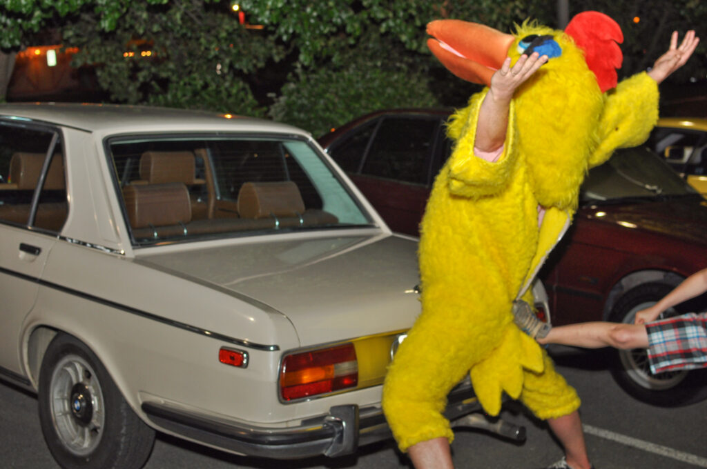 Perhaps it was the car’s vibe that attracted the guy in the chicken suit in the hotel parking lot. From the photos, it looked like Bavaria Lust. I have no other explanation, and those who witnessed the assault have remained strangely quiet about the incident. I guess you had to be there. Seriously. And I was sound asleep at the time.
