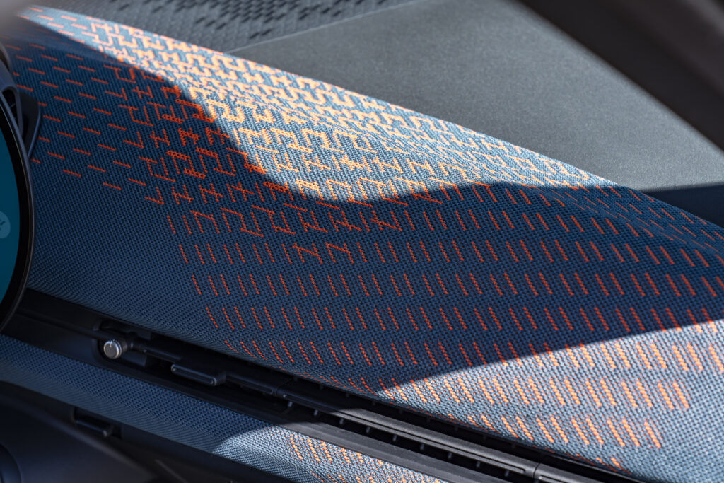 The gentle, rounded design style of the interior is further reflected in the curved surfaces of the dashboard: the latter’s surface is covered with a knitted material in which the lower color shines through the upper one. This gives the interior a homely character with starkly accentuated color contrasts. Extending to the interior door trim, the easy-care, versatile structure is made of recycled polyester. Rounding off the high-quality fittings in the cockpit are comfortable seats, optionally featuring a textile surface or made of perforated Vescin.