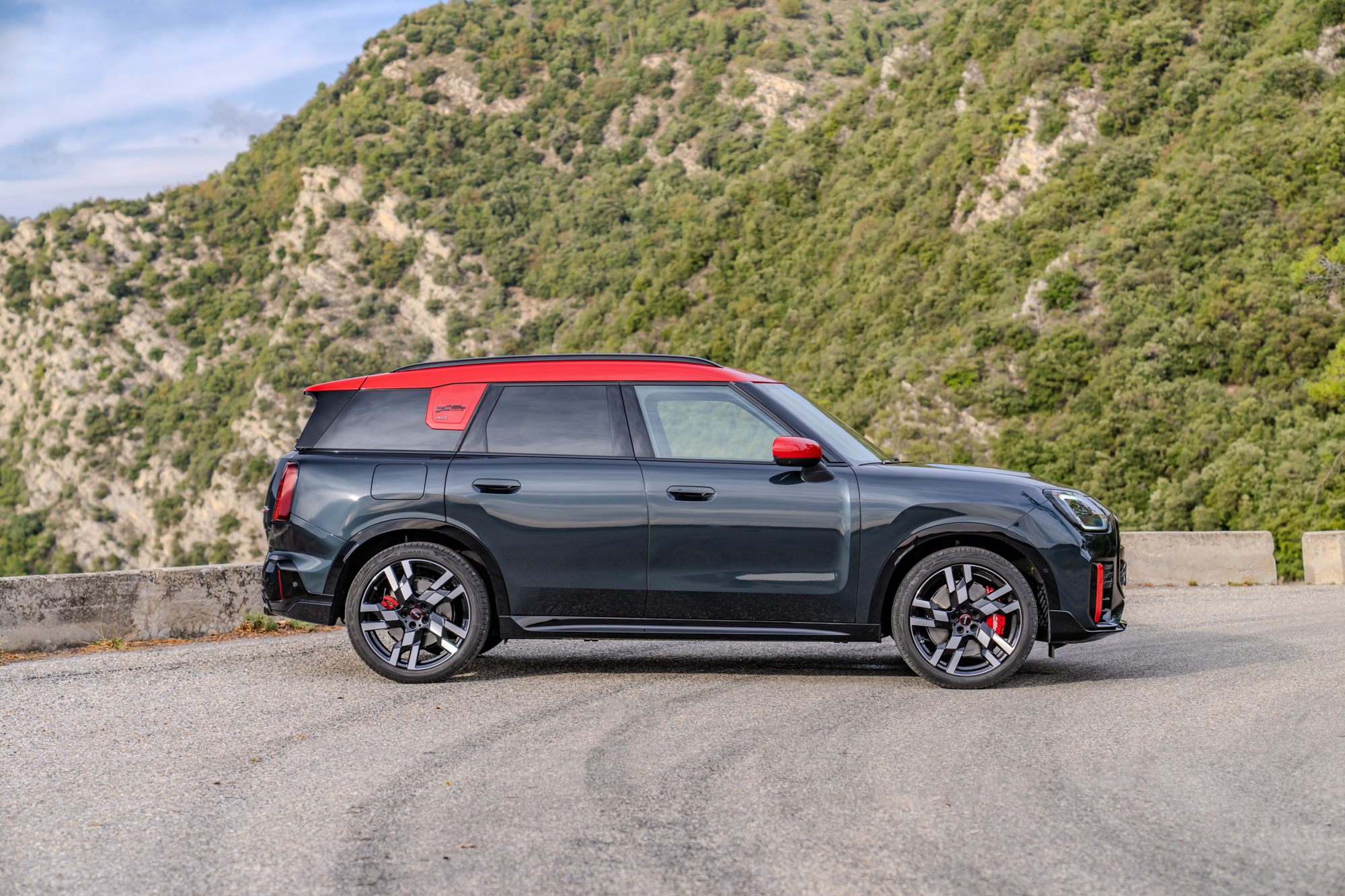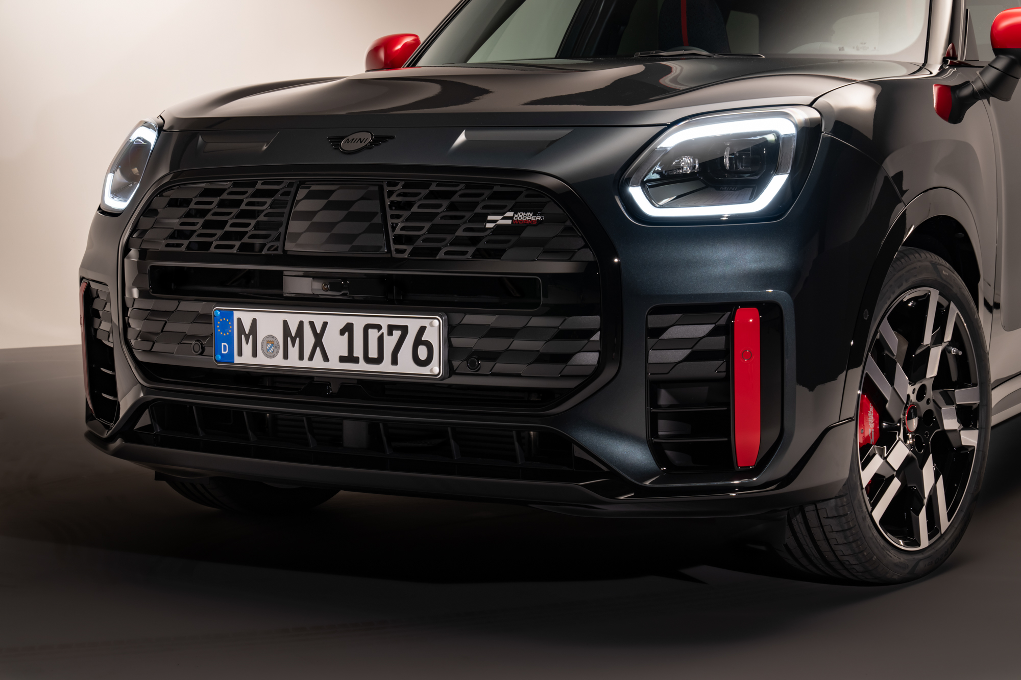 The exterior has been given the JCW treatment, setting it apart from the standard Countryman. MINI explains, “aerodynamic elements with vertical reflectors on the front of the vehicle emphasize its wide stance, while the new MINI LED headlights with horizontal bars in JCW Signature Mode give the vehicle a more expressive look.” A new JCW logo is adorned on the fresh octagonal grille.
