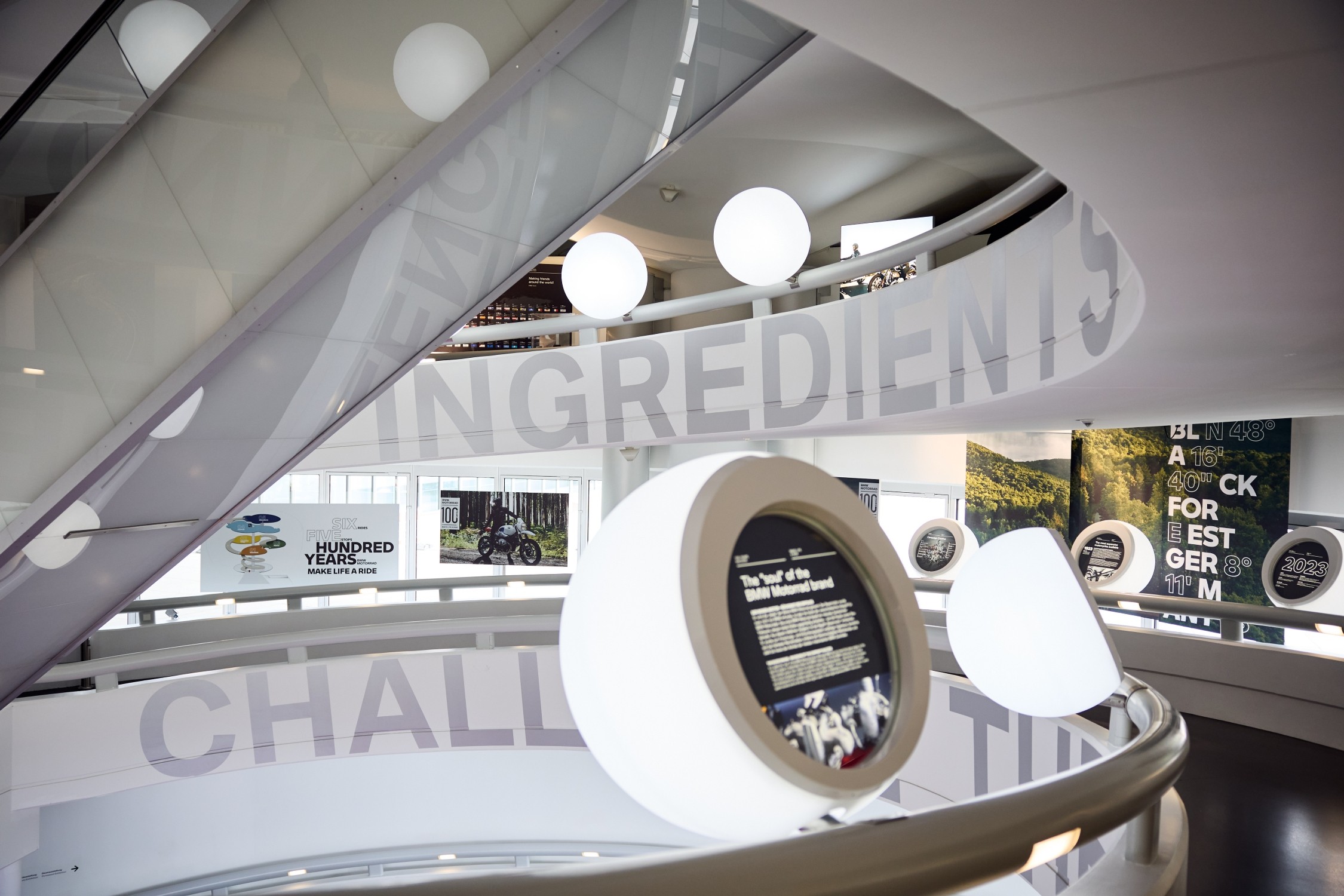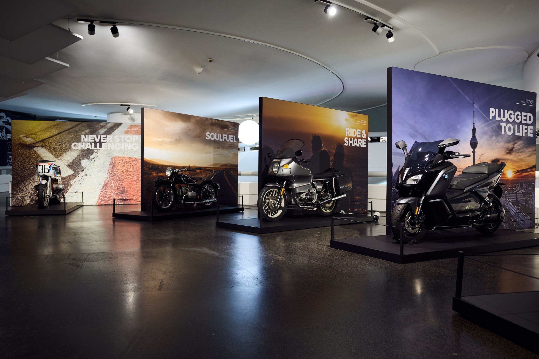 Here, the anniversary exhibition honors the drivers, designers, and developers from 100 years of BMW Motorrad history and, at the same time, references fascinating production in the BMW Group plant in Berlin-Spandau.