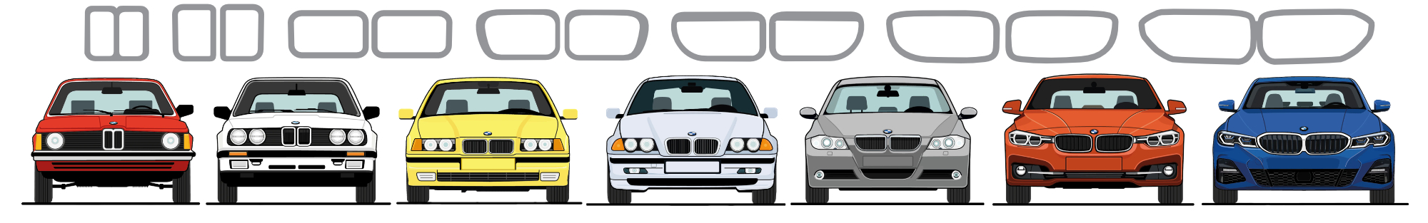 Each of the seven generations of the 3 Series have distinct grille designs. (Images courtesy of BMW AG).