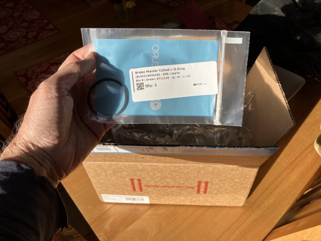 Last week, I was less than thrilled to find that Bertha’s low brake fluid was caused by it leaking out the master cylinder’s rear seal and into the brake booster, but that disappointment was nicely mitigated by remembering that one of the parts hoards I’d inherited a few years back contained a tii brake master cylinder with “23” (the bore size in millimeters) unambiguously embossed on the side. I was about to install it when I realized that it was missing the rubber O-ring on the back that forms the vacuum seal for the booster. I thought about re-using the old O-ring, or using a generic one that appeared to be about the right size, but the part was only about $3 on FCPEuro, and since they’re just down in CT, if I order something in the morning, it usually gets here in two or three days. I do, however, balk when I’m ordering something small and flat like an O-ring and they still charge me $6.99 for shipping when they could just slip it into a first-class envelope, but this is not a hill I’m going to die on. So I clicked, ordered, and waited. Sure enough, the 12-pack-sized box arrived on Tuesday.