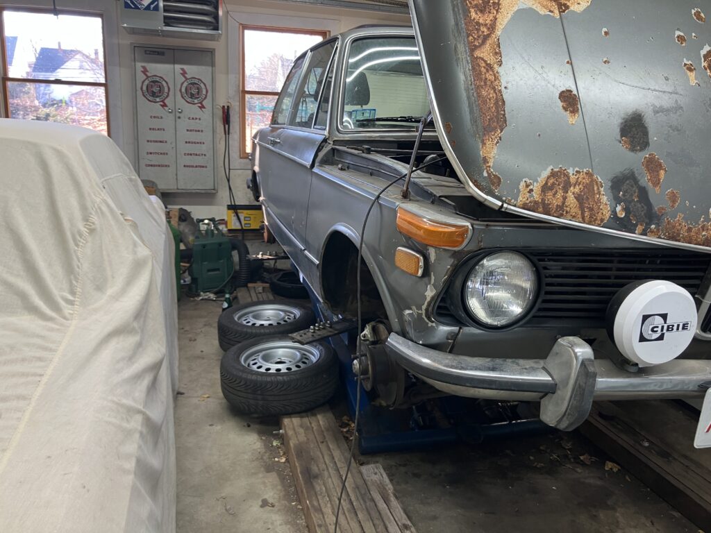 After one round of bleeding, the brake pedal came up nice and firm. I thought I’d beat the imminent snow and take the car for a test drive, but then realized that with it still up on the mid-rise lift, I can see if I can loosen the splines on the steering column and replace the balky steering box (one of the things on my list). So I think I’ll let it hang out in the Garage Space of Honor for a bit longer.
