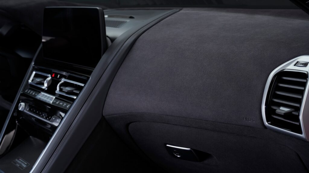Moving inside, the M850i Edition M Heritage features unique seating, upholstery, and trim elements not available for order on other 8 Series models. The driver and front passenger are provided M Sport seats finished in BMW Individual Black Full Merino Leather and Alcantara, with a diamond-shaped upholstery pattern. Alcantara also graces the headliner, dashboard, and upper door panels. The seats, door panels, and seat belts all feature M tri-color stitching, and there is a special, non-illuminated M badge in each front seat headrest.